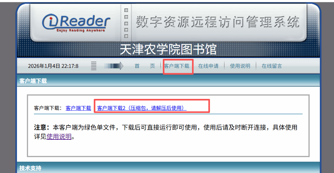 为了更好的服务我校师生在校外使用图书馆数字资源,2026年1月5日已对iReader远程访问系统,进行升级,升级后不再受浏览器的限制,可以支持常用的谷歌、火狐、360等浏览器。升级后再次使用,需要用户重新下载最新的访问客户端。(原有客户端文件直接删除即可)