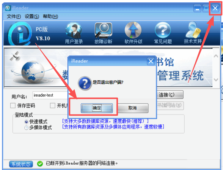 (2) 用户在使用完毕后,请及时退出IREADER客户端方法如下: