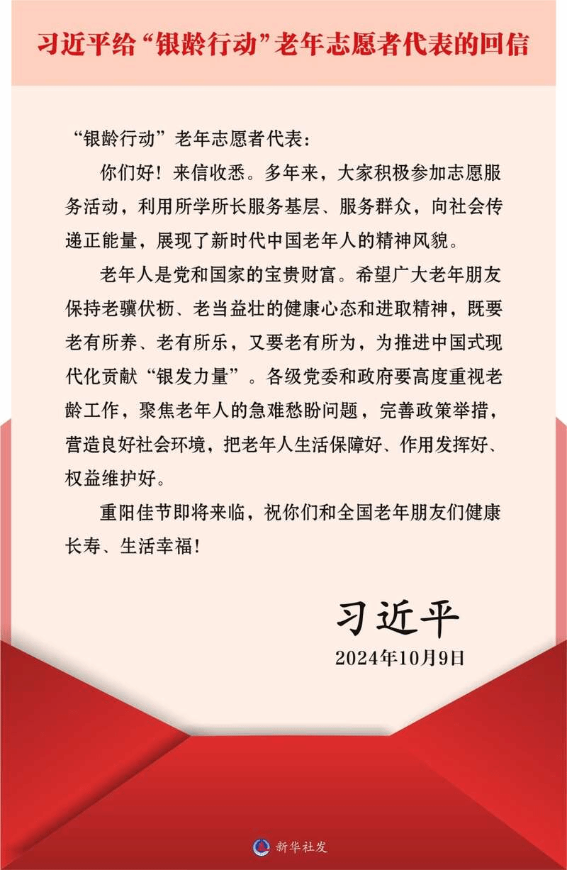 2024年10月9日,习近平总书记给“银龄行动”老年志愿者代表回信,他在信中说:“希望广大老年朋友保持老骥伏枥、老当益壮的健康心态和进取精神,既要老有所养、老有所乐,又要老有所为,为推进中国式现代化贡献‘银发力量’。”