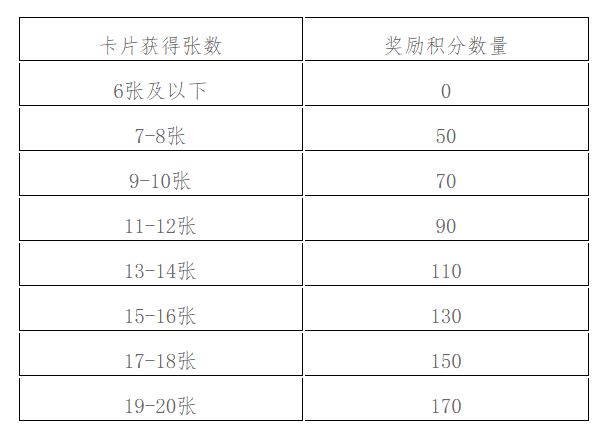 在活动参与时间内,读者每日签到后(补签的签到不再获得卡片机会,只以当天签到为准)获得一张抗战主题的卡片,连续签到满7天额外获得3张卡片,7天为一个周期,整个活动周期满签最多可以获取20张卡片;集不同数量的卡片张数,可以获得不同数量的奖励积分,获取的奖励积分可以累计到总积分的排行榜。